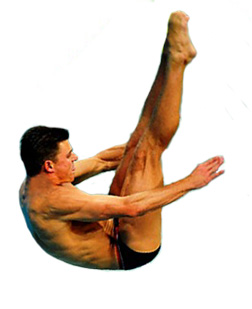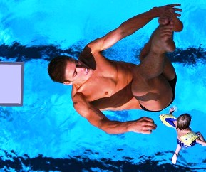 A favorite dive for me was a reverse Pike dive which divers normally referred to as a "gainer." The diver faces toward the pool but on springing from the diving board, the diver throws the head back towards the board and rotates in a reverse of a forward dive. The ceiling on the Hall of Waters pool was close enough to touch if the diver really tried to do so. It was my last time at the Hall of Waters at the age of 14. I was showing off my repertoire of dives for the visitors and swimmers. I was the only person using the 3 meter board and I was executing one dive after another in rapid succession. I started the gainer dive sequence with the reverse pike dive which was a one half gainer where the diver bounces his feet out away from the board and up at the ceiling, touches his hands to his feet and falls the upper body back down outward of the diving board and toward the water below. My dive was completed as I became absolutely vertical coming down at about diving board height when I saw a young boy had jumped out from pool edge into the pool and was directly where my head would enter the water. Recognizing the dangerous situation, I immediately snapped my head down and tried to somersault into a feet first entry. There was not enough distance to complete the tuck rotation and my left hip hit the top of the boy's head. I felt a sharp pain in my lower back on impact and felt the boy below me in water. Reaching down with my right hand, I pulled him up to the surface and struggled with him over to the pool edge where I pushed and rolled him face down on the tile. The Lifeguard immediately went to work on the young boy.