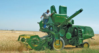 We were a convoy of four trucks led by Buck Green hauling his Combine. Skip followed in Buck's second truck which contained all the support equipment for Buck's combine. Bill was number three with his combine. I was last with Bill's support equipment. We left Kansas City and trucked southwest to somewhere near Amarillo and worked the wheat fields slowly moving north in step with the ripening of the wheat. The combines rode high up on the International Trucks and overhanging wires required frequent stops when going through small towns. We carried long poles to raise the electric and telephone wires high enough to allow passage of the combines. The people were friendly and kind at every place we worked. Once, I missed the only stop light in a town and came to a Y at the edge of town. I went left and soon found myself on the open highway with the visibility at least 40 miles. No combine laden trucks were ahead. I quickly U-turned and went back for the right fork I missed. It was a big relief to catch up with the combines after only 20 minutes.